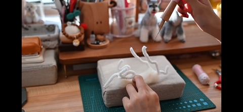Step 9: Add Paws Cover the bottom of the pipe cleaner with felt and merino roving until it becomes slightly dense. Make several loops with a thread of the same color and pull to make the right number of toe indents. To cover the thread, felt a small amount of merino wool between the toes after completion.